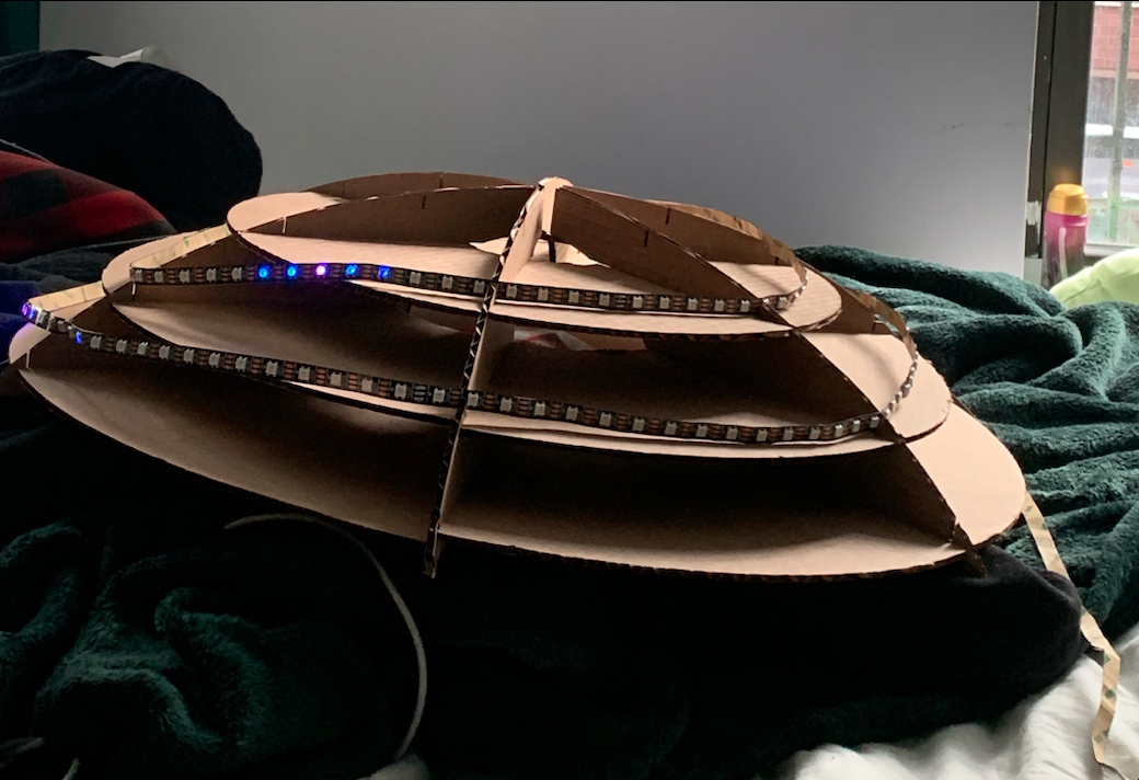 We cut notches in the hat so that we could place the LEDs in three layers. A friend soldered them together, and then to an ESP8266, which allowed us to program the lights using WLED and LEDFX. The ESP8266 was connected to a portable battery so that we could wear the hats and move around. The ESP8266 has WiFi, so we were able to control the LEDs from our phones.